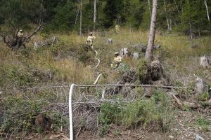 Die restlichen Feuerwehren des Abschnittes waren mit dem Aufbau der Relaisleitung betraut. Hierzu wurden sie, je nach Zeitpunkt des Eintreffens von einem Lotsen an den nächsthöheren Pumpenstandort geschickt und konnten von oben mit dem Weiterbau der Leitung beginnen. Ziemlich genau eine Stunde nach Alarmierung war die Relaisleitung mit 7 TS und ca. 70 B-Längen fertig aufgebaut. Von der Übungsleitung wurde dann ein Ausfall einer TS angewiesen, was den Tausch einer Pumpe und das Wiederanfahren der Relaisleitung zur Folge hatte. Auch dieses Manöver wurde tadellos absolviert.