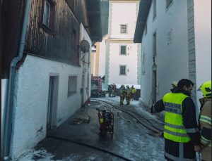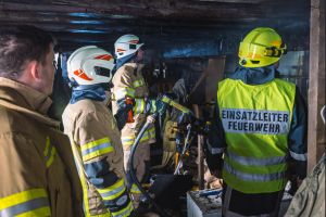 Beim Eintreffen war eine starke Rauchentwicklung im Stall und der darüber liegenden Tenne zu sehen. Eine im Brandraum befindliche Gasflasche wurde noch vom Hausbesitzer ins Freie gebracht. Der erste Atemschutztrupp konnte mit Hilfe der Wärmebildkamera den Brandherd schnell lokalisieren und ein Übergreifen des Brandgeschehens in die Tenne verhindern.