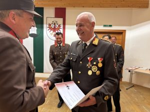 Nach den Beförderungen durften wir die Ehrungen durchführen. Für 25 Jahre Mitgliedschaft erhielten HFM Martin Eller und OBM Roland Plattner, für 40 Jahre Mitgliedschaft HFM Robert Riedl eine Ehrung.